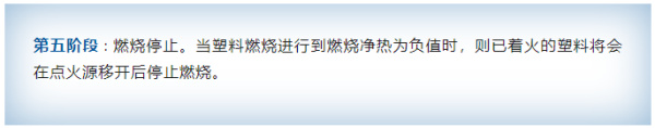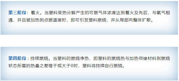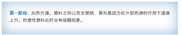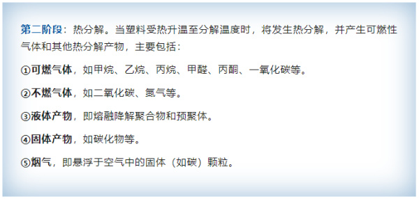 塑料的燃燒過程是一個非常激烈復(fù)雜的熱氧化反應(yīng),具有冒濃煙或熾烈火焰的特征。塑料燃燒的一般過程可分為5個基本階段。